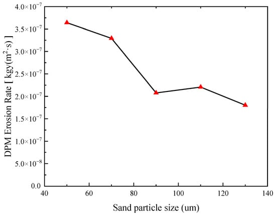 Using the above model to simulate the conditions of a particle mass flow rate of 1 × 10−3 kg/s, an inlet pressure of 100 MPa, and particle diameters of 50 μm, 70 μm, 90 μm, 110 μm, and 130 μm, and the maximum erosion rate at the wellbore outlet was simulated (Figure 12). It can be seen that the erosion shape of the wellbore outlet wall has a point-like distribution. The larger the particle diameter, the sparser the erosion point distribution, and the erosion point gradually moves up. The maximum wellbore erosion rate under different particle diameters was extracted (Figure 13). The maximum erosion rate of the wellbore outlet wall gradually decreases and then tends to be gentle. When the particle diameter increases from 50 μm to 130 μm, the maximum erosion rate decreases from 3.64 × 10−7 [kg/(m2 s)] to 1.80 × 10−7 [kg/(m2 s)], a decrease of 50.55%. This is due to the fact that the increase in particle diameter will reduce the number of particles and reduce the maximum erosion rate when the particle mass flow rate is fixed. When the diameter of a single particle increases to the critical particle size, the erosion effect of a single particle collision will be significantly aggravated, making up for the decrease in the number of particles.