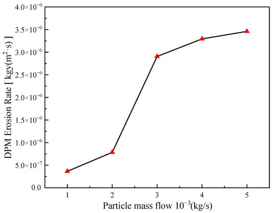 The above model was used to simulate an inlet pressure of 100 MPa, a particle size of 50 μm, a particle mass flow rate of 1 × 10−3 kg/s, 2 × 10−3 kg/s, 3 × 10−3 kg/s, 4 × 10−3 kg/s, and 5 × 10−3 kg/s, the maximum erosion rate at the wellbore outlet (Figure 14), and the maximum wellbore erosion rate under different particle diameters (Figure 15). It can be seen that with the increase in mass flow rate, the maximum erosion rate of the wellbore outlet wall gradually increases. When the particle mass flow rate increases from 1 × 10−3 kg/s to 5 × 10−3 kg/s, the maximum erosion rate increases from 3.64 × 10−7 [kg/(m2 s)] to 3.46 × 10−6 [kg/(m2 s)], an increase of 850.55%. This is due to the fact that with the increase in particle mass flow rate, the frequency of collisions between particles and the wall surface increases, which increases erosion wear.