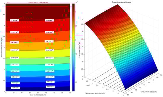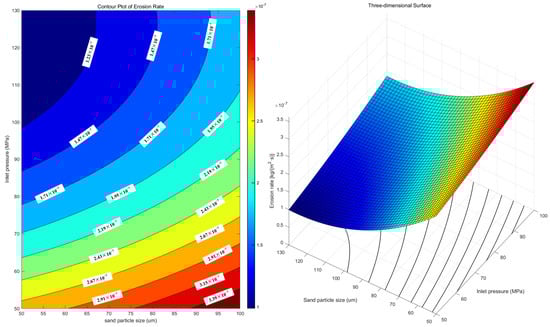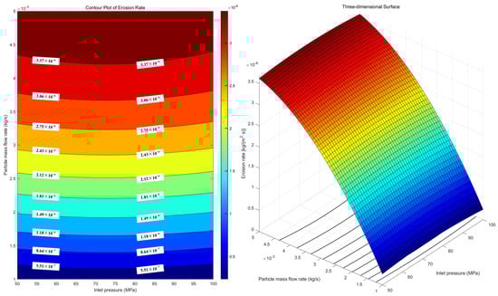 It can be seen from the figures that the interaction between particle mass flow and inlet pressure has the greatest influence on the erosion rate, and the interaction between inlet pressure and particle diameter has the least influence on the erosion rate. However, by comparing the response surface of inlet pressure and particle mass flow rate with the response surface of particle diameter and particle mass flow rate, it is found that the two graphs are close to each other. The particle diameter and inlet pressure have no significant effect on the erosion rate, which is consistent with the increase in the maximum erosion rate in the previous article.