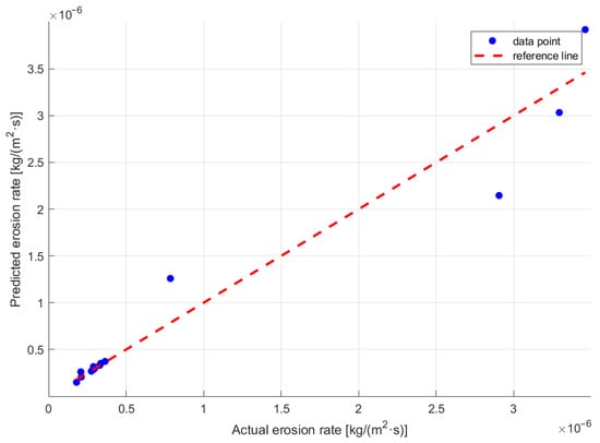Equation (16) was obtained by using the multiple regression model of the linear interaction term, and the value of R2 was 0.962941. The comparison between the actual values and the predicted values is presented in Figure 19. It can be found that the prediction of low erosion rates is better.