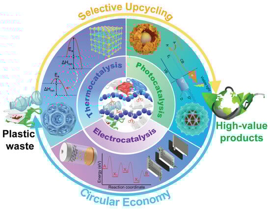 - Liu, Y.; Duan, H. Recent progress in upcycling of plastic wastes into value-added chemicals via photo-, electro- and photoelectro-catalytic strategies. Fundam. Res. 2025, 5, 913–918. [Google Scholar] [CrossRef]