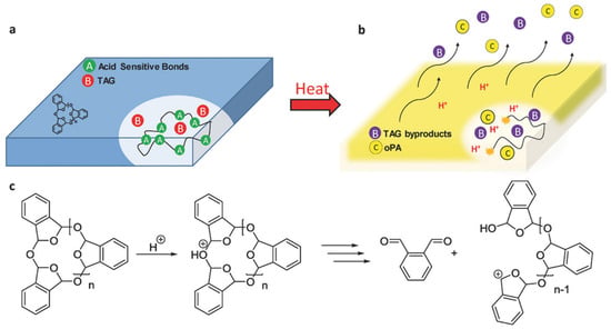 Thermally triggered acid-catalyzed depolymerization of cyclic polyphthalaldehyde (cPPA). (a) A thermoacid generator (PVtBCS) is dispersed within a cPPA film. (b) Upon heating, the generator releases acid, which protonates the cPPA backbone, cleaving the acid-sensitive acetal linkages and producing volatile monomeric o-phthalaldehyde (oPA). (c) Mechanistic representation of the acid-catalyzed depolymerization of cPPA. Reproduced from reference [81].