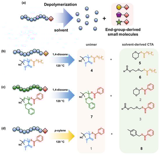 (a) End-group-derived products resulting from the depolymerization of different RAFT polymers: (b) PMMA-TTC in 1,4-dioxane, (c) PBzMA-DTB in 1,4-dioxane, (d) PMMA-DTB in p-xylene. Adapted from reference [82].