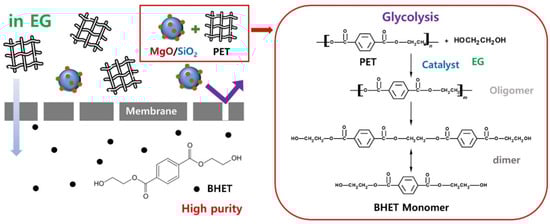 - Kim, H.E.; Park, I.; Kim, S.; Kim, J.F.; Choi, Y.H.; Lee, H. Chemical recycling of polyethylene terephthalate using a micro-sized MgO-incorporated SiO2 catalyst to produce highly pure bis(2-hydroxyethyl) terephthalate in high yield. Chem. Eng. J. 2024, 499, 155865. [Google Scholar]