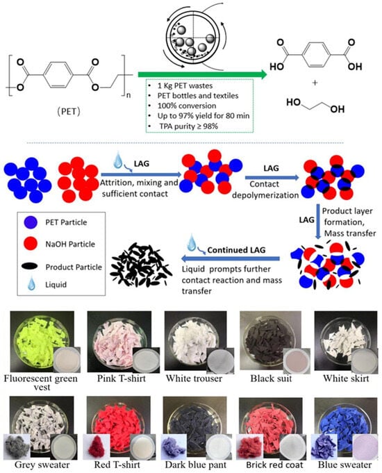 Schematic and visual representation of mechanochemical catalytic depolymerization of PET waste into reusable monomers. Images display PET textiles with varying PET content; the lower-right insets show recovered TPA, and the lower-left insets show solid residues. Glass dish diameter: 15 cm. Reproduced from reference [92].