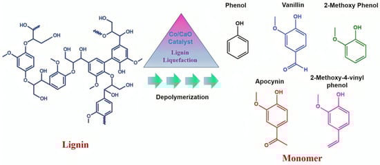 Catalytic depolymerization of lignin using cobalt-supported calcium oxide (Co/CaO) catalysts, yielding selective phenolic monomers under mild reaction conditions.