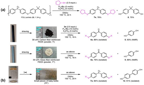 (a) Gram-scale depolymerization of PSU pellets (1.34 g) into monomer (7e, 8) using cyclopentane thiol with P4-tBu (5 mol%) and K3PO4 (5 mol%) in DMAc at 150 °C. (b) Decomposition of 30% carbon fiber- or 30% glass fiber-reinforced PEEK and a PPSU baby bottle into monomer (4a, 5, 7a, 12) using 2-ethylhexanethiol and P4-tBu (10 mol%) with K3PO4 (5 mol%) at 150 °C. Reproduced from reference [96].