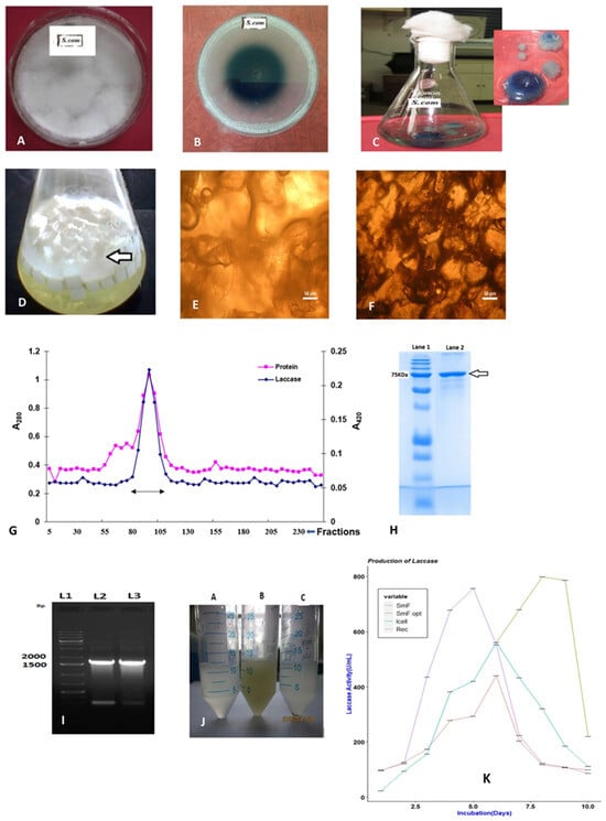 Laccase production using the white-rot fungus Schizophyllum commune NI-07: (A) pure culture on Malt Extract Agar; (B) growth on Laccase Detection Agar with ABTS; (C) submerged culture in Modified Liquid Basal Medium (LBM); (D) immobilized culture using polyurethane foam (PUF); (E,F) phase-contrast microscopy of PUF before and after immobilization; (G) elution profile from Sephadex G-50 gel filtration; (H) SDS-PAGE of immobilized laccase; (I) colony PCR confirming presence of Scom-lac gene in E. coli transformants; (J) laccase expression in methanol-induced cultures; (K) comparative laccase production across different fermentation methods. One unit of laccase is defined as the enzyme activity converting 1.0 μmol of ABTS per minute. Adapted from reference [101].