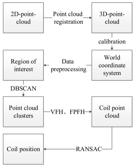 For 3D point cloud model fitting, a template matching method and RANSAC fitting method are often used [27]. The template matching method builds a database of feature description vectors of similar models, and uses KD-tree to speed up the query of the nearest model in the feature description vector space as the model fitting result. However, due to the instability of the surface shape of the coils, it is easier for the template matching method to make mistakes. At the same time, the template matching method needs a lot of data, which will reduce the efficiency of the algorithm; the fitting method based on RANSAC sets a model type in advance and iteratively selects the model parameters with the most points in the model until the end of the algorithm, when the upper limit of the number of iterations or the number of points threshold is qualified; this method does not need a lot of data as the database search range and the amount of calculation are smaller in the paper. The cylinder is used as the target model of coil fitting.