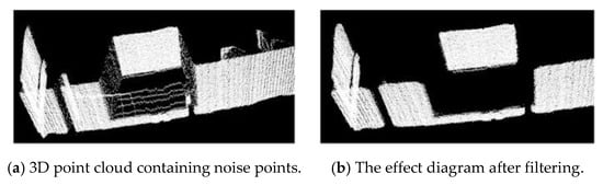 Due to the influence of equipment accuracy, operator experience, object surface laser reflectivity, and other factors, some noise points often appear in point cloud data. Therefore, as the first step of point cloud processing, point cloud filtering can remove outliers, compress data, smooth data, etc. The commonly used point cloud filtering algorithms include direct filtering, voxel filtering, statistical filtering, conditional filtering, and radius filtering [18]. The direct filtering is used to set a fixed coordinate axis to filter the range, leaving the point cloud in the range; the voxel filtering uses the bounding box to voxel the point cloud, so as to realize the downsampling without destroying the geometric structure of the point cloud itself. Statistical filtering is used to calculate the average distance between the target point and its adjacent k points, and it is considered that the distance between different points accords with Gaussian distribution by counting the distance mean and variance of global points and removing the point cloud with low distribution probability, as shown in Formula (3). Because conditional filtering and radius filtering often need to set fixed filtering conditions, the robustness is often poor. In the paper, after the region of interest is selected by direct filtering, voxel filtering is used to compress smooth data, and finally statistical filter is used to remove outliers. Figure 2a shows the 3D point cloud containing noise points before filtering, and Figure 2b shows the effect diagram after filtering.