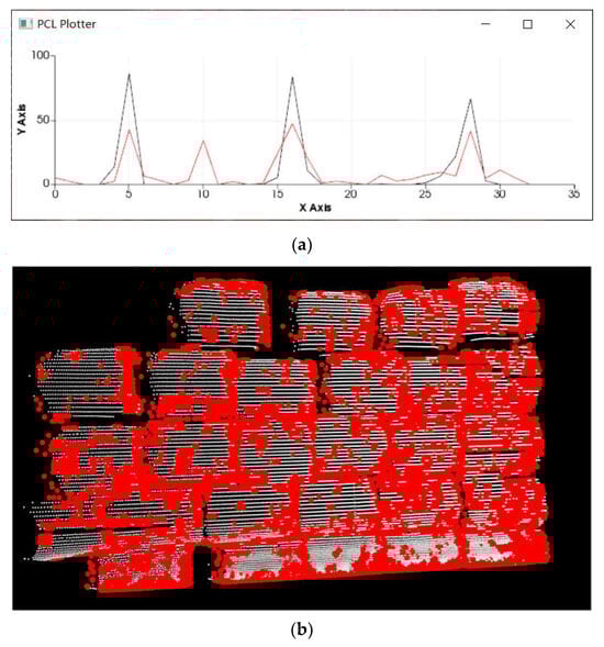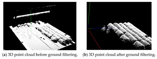 In the generated 3D point cloud map, because of the huge number of ground points, the calculation efficiency will be reduced. At the same time, because of the adhesion between ground objects and ground point cloud, the accuracy of target classification and recognition will be reduced. Therefore, extracting and filtering ground points can improve the calculation speed and reduce the amount of calculation, and improve the efficiency and accuracy of the Method [19], as shown in Figure 3; Figure 3a,b are the 3D point cloud before and after ground filtering.