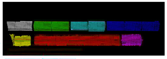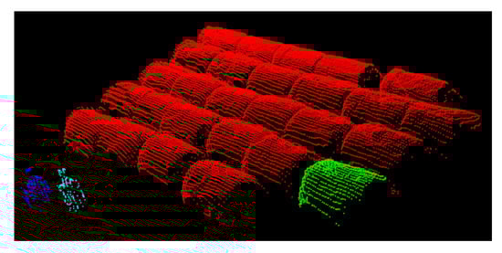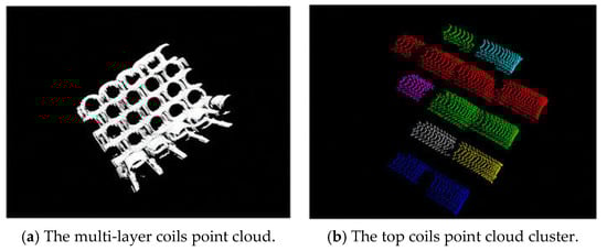 When clustering point cloud data, over-segmentation or under-segmentation is often caused by the selection of clustering methods and thresholds. The clustering and segmentation methods of a point cloud usually include region growth segmentation, DBSCAN clustering, k-means clustering, etc. Due to the irregular geometry of the coils and the change in the normal direction, the region growth method based on the normal often suffers from over-segmentation [20]. After adopting the DBSCAN clustering method and debugging threshold, the clustering result of point cloud is shown in Figure 4, and the number of points in each cluster is shown in Table 1.