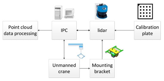 At present, the cost of 3D LiDAR is high and its data volume is larger. By installing the 2D LiDAR under the cab of the unmanned crane and combining the gray bus information when the unmanned crane moves, the 3D point cloud map is constructed. The system hardware includes a 2D LiDAR, LiDAR mounting bracket, calibration board, industrial control computer, and unmanned crane, as shown in Figure 6.