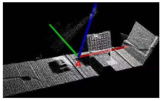 In the experiment, the calibration plate is placed on the ground obliquely, and the projection of the normal vector of the plane of the calibration plate on the horizontal plane is parallel to direction. After the LiDAR dynamically scans the calibration plate and its surrounding environment with the unmanned crane, a three-dimensional point cloud is generated according to Equation (2). After a series of preprocessing for the LiDAR point cloud, the ground point cloud is selected, and the ground plane equation and calibration plate equation are obtained by fitting the plane model with the RANSAC method. The transformation matrix and are obtained to transform the LiDAR coordinate system to the world coordinate system , so that the 3D point cloud can be generated from 2D LiDAR data in the case of dynamic scanning, according to Equations (4) and (5). As shown in Figure 2, the 3D point cloud map is generated when the LiDAR dynamically scans the reservoir area with the unmanned crane.