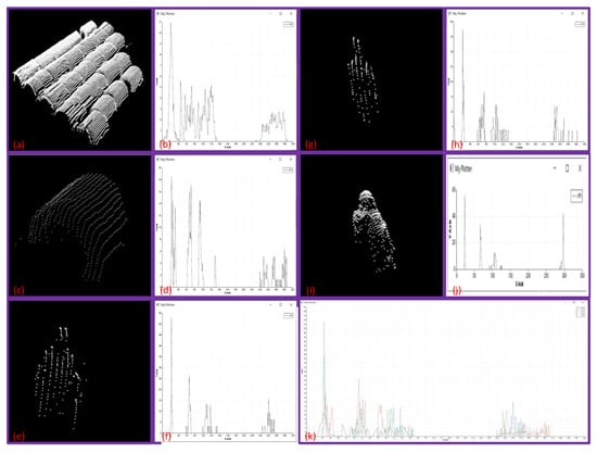 VFH analysis is carried out on the scanned coils point cloud and pedestrians point cloud. The cluster composed of the multiple coils point cloud and its VFH are shown in Figure 8a,b. The cluster composed of single coil point cloud and its VFH are shown in Figure 8c,d. The three pedestrian point cloud clusters with different poses and their VFH are shown in Figure 8e–j. Figure 8k shows all the point cloud clusters and their VFH, which are composed of different groups color representation.