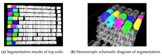 Due to the requirements of the on-site process flow of the unmanned crane, it is preferred if the top coils are hoisted and the outer diameter of the coils are within 1~1.3 m, so only point cloud clusters of the top coils are left through the elevation range. Starting from the height of 7 m, the window with the range of 0.5 m can slide to calculate the number of points contained in point cloud cluster under the current window. If it is larger than the threshold range of 300, the point cloud in the window is saved by direct filtering, and the point cloud of the top coils can be extracted. As shown in Figure 9, in the multi-layer coils point cloud in Figure 9a, the top coils point cloud cluster in Figure 9b is extracted, and the extracted point cloud only contains the upper part of the coils. For the case of coil cluster adhesion in the direction, DBSCAN clustering with a distance threshold of 0.1 m is adopted to distinguish the coils in different columns.