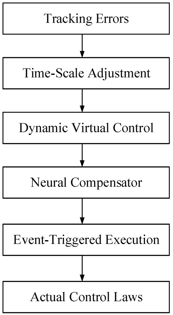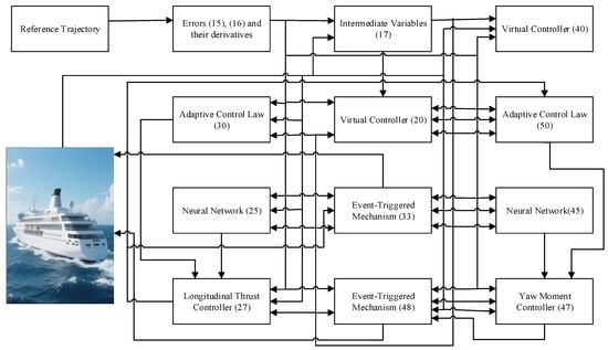 Given that is a function composed of and , it can be concluded that . There exists a positive constant such that . From this, it is straightforward to confirm that We havewhere . Based on inequality (71), we can deduce that the non-zero execution interval has a lower bound. Consequently, the Zeno phenomenon does not arise under the proposed control strategy, meaning such Zeno behavior is preventable. Remark 2. To elaborate on the design methodology of the event-triggered predefined-time adaptive neural control for robust trajectory tracking of underactuated marine vessels proposed in this paper, the architectural schematic (Figure 1), the abstract framework of the architecture (Figure 2), and the algorithmic design procedures (Algorithm 1) are sequentially presented. | Algorithm 1 Predefined-Time Adaptive Neural Control with Event-Triggering |