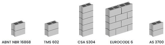 There are several standards that prescribe procedures for specifying masonry materials in the design and execution control. For example, the American standard TMS 602 [19], the Australian standard AS 3700 [20], the European standard Eurocode 6 [16], and the Canadian standard CSA S304 [21]. These guidelines establish technical criteria for evaluating the mechanical strength of structural masonry, contributing to the standardization of testing procedures and the reliability of experimental results. However, there is no uniformity between the requirements of each standard. For example, while the Brazilian standard NBR 16868-1 [15] establishes that, for this purpose, two-course specimens must be made, the European standard Eurocode 6 [16] prescribes minimum dimensions for the test specimens, which are dependent on the dimensions of the masonry units. Figure 1 illustrates the characteristics of the test specimens in different standards.