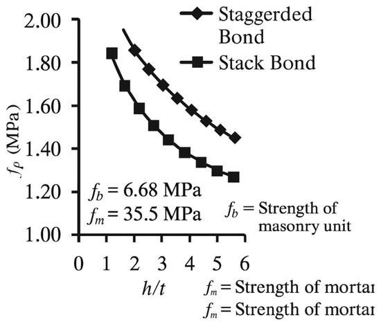 Masonry is characterized by its low tensile strength, as the interface between masonry units and mortar represents a structural weak point. As the height of the masonry specimen increases, the region subjected to lateral tensile stresses expands. This tensile zone is vulnerable to cracking, which contributes to the reduction in the overall strength of the masonry specimen as its height increases. Thus, the decrease in the mechanical strength of more slender specimens can be directly correlated with the increase in the h/t ratio [30]. Figure 3 presents data that corroborate this behavior.