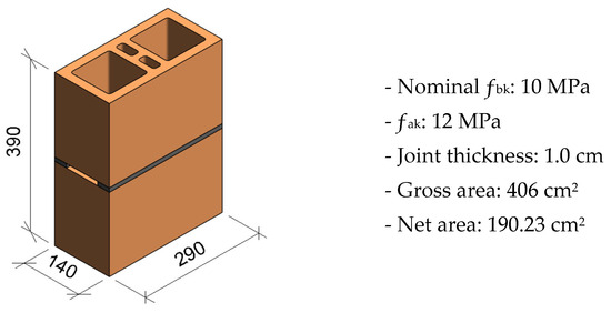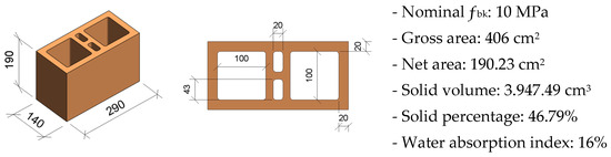 The materials used in this research consist of hollow clay masonry units with dimensions of 14 × 19 × 29 cm and a characteristic compressive strength (fbk) of 10 MPa. These masonry units are classified as EST100 according to NBR 15270-1 [39], the Brazilian standard that defines requirements and specifications for masonry clay units.