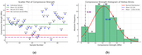 Scatter plot (a) and histogram (b) of compressive strength of the units. fbk: estimated characteristic compressive strength of masonry units, according to Brazilian standard NBR 15270-1 [39]; fbk nominal: specified compressive strength of the masonry units, according to Brazilian standard NBR 15270-1 [39].