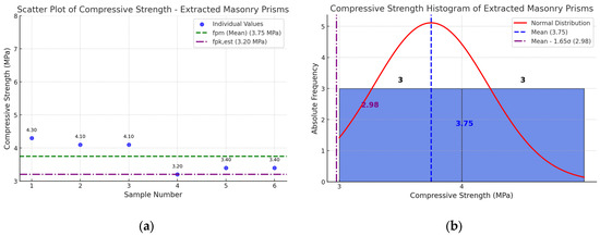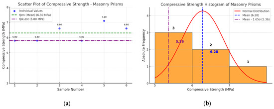 Scatter plot (a) and histogram (b) of compressive strength of the three-course masonry specimens, extracted from full-scale masonry. fpm: average compressive strength of masonry units, according to Brazilian standard NBR 16868-1 [15]; fpk,est: estimated characteristic compressive strength of two-course masonry specimens, according to Brazilian standard NBR 16868-1 [15].
