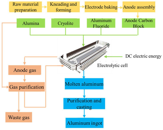 Schematic diagram of electrolytic aluminum production.