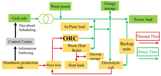 Some experts and scholars have also conducted research on low-carbon production and dispatch in power systems. Tian Biyuan and Chang Xiqiang et al. [8] achieved low-carbon economic dispatch in distribution networks through demand response and shared energy storage usage rights. Cui Yang and Deng Guibo et al. [9] designed a low-carbon economic dispatch strategy for a concentrated solar power-wind hybrid system, considering carbon trading mechanisms and analyzing technical and policy aspects to reduce overall operational costs. Chen Jinpeng and Kang Lihong et al. [10,11] accounted for the actual carbon emissions of loads, refined carbon emission models, and introduced carbon trading mechanisms to further constrain emissions in integrated energy systems, balancing economic and low-carbon objectives through flexible scheduling of heating and cooling loads. However, these low-carbon dispatch studies primarily target renewable energy and integrated energy systems, excluding high-energy-consuming enterprises. In fact, as early as 2019, the China Nonferrous Metals Industry Association issued the “Technical Guidelines for Carbon Emission Trading in Electrolytic Aluminum Enterprises” [12], detailing the carbon trading management system and technical specifications for such enterprises, with pilot programs implemented in multiple provinces. Some AI technologies have also been introduced into the field of power system scheduling to enhance decision-making efficiency and accuracy. Fan Shixiong et al. [13] proposed a framework and key technologies for a human–machine hybrid augmented intelligence system for large-scale power grid dispatching and control. This study offers new ideas and methods for the dispatching and control of large-scale power grids. Z. Liu et al. [14] presented a brain-inspired collaborative power dynamic dispatch method for digital twin smart generation systems. By drawing on the brain’s collaborative mechanisms, this method provides an innovative solution for power dynamic dispatch in digital twin environments. J. Chen et al. [15] achieved stochastic dynamic power dispatch with human knowledge transfer using inverse reinforcement learning assisted by Graph-GAN. M. Li and J. Mohammadi [16] conducted research on optimization learning for joint chance-constrained power dispatch problems, offering an effective approach to handling uncertainty factors in power dispatching. D. Ma et al. [17] proposed an implicit dual gradient tracking algorithm under a randomly triggered transmission protocol for distributed economic dispatch with dynamic power demands. Y. Zhang et al. [18] introduced a PI + R control scheme based on a multi-agent system for economic dispatch in isolated battery energy storage systems. This scheme leverages the advantages of multi-agent systems and combines them with the PI + R control strategy to achieve effective economic dispatch in isolated battery energy storage systems. Additionally, the abundant waste heat resources in electrolytic aluminum enterprises have rarely been addressed in previous dispatch and production studies. The aluminum production process involves stages such as petroleum coke calcination and anode baking, generating large amounts of high-temperature flue gas. Preliminary estimates suggest that adopting waste heat recovery technology can reduce energy consumption by 200–300 kWh per ton of aluminum, equivalent to saving 1.5–2 million tons of standard coal [19]. Today, Organic Rankine Cycle (ORC) technology, based on different working fluids, has advanced significantly, enabling the recovery of low-grade waste heat from electrolytic cells [20,21]. Many domestic aluminum enterprises have already implemented waste heat recovery systems. For instance, since its launch in 2019, Yunnan Aluminum’s flue gas waste heat utilization system has cumulatively reduced greenhouse gas emissions by 7566 tons and achieved energy-saving benefits worth 6.9137 million yuan. This demonstrates that integrating aluminum production waste heat into power system dispatch and internal production processes, while consolidating waste heat resources of varying grades, can significantly improve resource utilization efficiency and enhance both economic and environmental benefits.