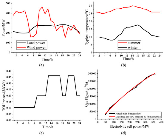 Parameter setting in the testing system. (a) Load and wind power output curve, (b) typical winter and summer temperature curves, (c) TOU prices curve, and (d) fitting curve of main flue gas.