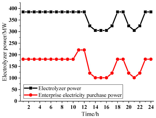 Under typical summer daily temperatures, the electrolyzer power and the aluminum production enterprise’s power purchase from the grid are shown in Figure 4.