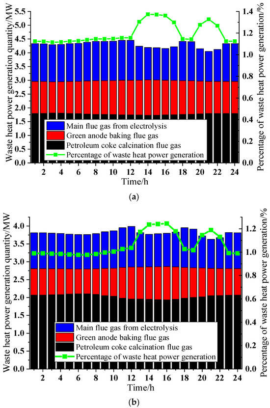 The calculation results in Figure 5a,b show that under typical summer day conditions, the waste heat utilization power generation mostly ranges between 4 and 4.4 MW, accounting for approximately 1.1–1.4% of the aluminum electrolysis enterprise’s total power consumption, with the enterprise’s total revenue reaching USD 71,701 in this scenario. Additionally, during peak electricity price periods such as 12:00–16:00, the enterprise reduces power consumption to save production costs, resulting in two peaks where waste heat generation accounts for the highest proportion of total power usage. Under typical winter day conditions, waste heat power generation mostly ranges between 3.6 and 4.0 MW, constituting about 0.9–1.1% of the enterprise’s total power consumption, with a total revenue of USD 71,190 in this scenario. It is evident that the winter scenario generally shows slightly lower values than the summer scenario in terms of waste heat recovery power, its proportion to total power consumption, and enterprise revenue, primarily due to lower winter temperatures reducing waste heat recovery efficiency and consequently affecting both final waste heat generation and enterprise profits.
