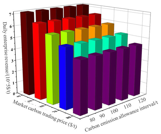 Figure 6 demonstrates the impact of different market carbon trading prices (λ) and carbon emission interval lengths (d) on the daily revenue of aluminum production enterprises. The case results show that when the market carbon trading price λ is USD 40/t with an interval length d of 80 t, the enterprise’s revenue reaches USD 71,701. When λ remains at USD 40/t but d increases to 120 t, the revenue becomes USD 71,941; when λ rises to USD 80/t with d at 80 t, the revenue drops significantly to USD 44,415. Clearly, as the market carbon trading price increases, the enterprise’s carbon trading costs gradually rise, leading to a substantial reduction in profits. On the other hand, when the carbon trading price remains relatively stable, a larger allocated emission interval length results in higher enterprise revenue. However, due to the significant carbon emissions per ton of aluminum produced, the market carbon trading price has a more pronounced impact on the enterprise’s profitability compared to the emission interval length.