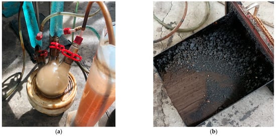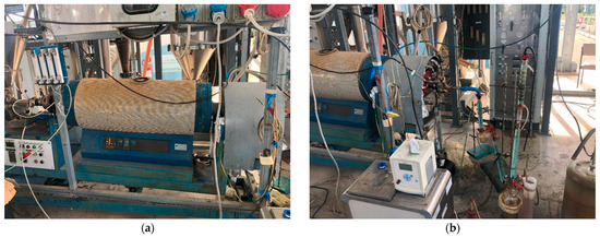 Some details of the bench-scale rotary kiln pyro-gasifier test facility are shown in Figure 3. The images clearly show (a) the rotary kiln reactor equipped with electric heaters and its temperature control system, and (b) the condenser where the liquid fraction is collected at the end of each test.
