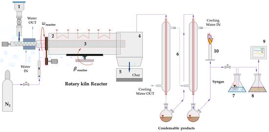 With reference to the layout of the bench-scale pyrolysis system shown in Figure 2, the feedstock was loaded in the hopper (1). An electrical furnace (2) surrounds the rotary kiln reactor (3) to provide the thermal energy required for the pyrolysis process. A screw conveyor fed the feedstock to the reactor. To prevent vapor formation from the feedstock, the walls of the screw conveyor were cooled by circulating water through a surrounding jacket. When a sorbent was used, it was premixed with the digestate before loading into the hopper (1). During the pyrolysis process, in addition to the solid feed, a controlled stream of nitrogen was introduced. This allowed for the quantification of the produced syngas by determining the nitrogen mole fraction in the gas stream. The pyrolysis products were char, condensable liquids, and gas. Condensable products and gas crossed the plenum chamber (4), whose temperature was kept above the condensation point of the vapor fraction. Char was collected in a bottom reservoir (5). Condensable products, mainly pyrolysis oils and water, were liquified in the condensation section (6), while the gas crossed it.