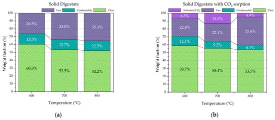 Product distribution of digestate pyrolysis (a) and digestate pyrolysis with CO2 sorption (b).