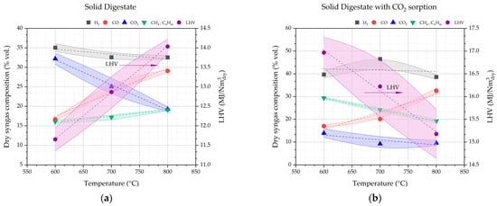 The maximum heating value of syngas (16–17 MJ/kg) was coherently detected with the CO2 sorption tests and at 600–700 °C, where the methane and light hydrocarbons concentrations were the highest (30–25 vol%) (See Figure 5a,b).
