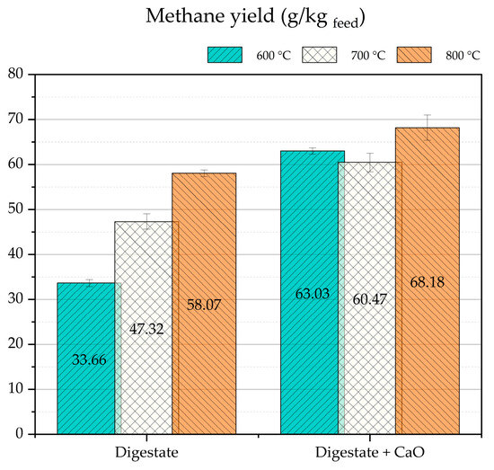 Considering the goal of this work, to obtain a methane-rich syngas by thermochemical conversion of digestate, it is very useful to evaluate quantitatively the methane yield for a digestate mass unit. About this parameter, Figure 7 shows that, with the CaO addition, the higher methane yields were obtained. Particularly, the highest value of about 68 g/kgdigestate was obtained at 800 °C. Moreover, the data in Figure 7 demonstrate that the presence of CaO significantly mitigates the effect of pyrolysis temperature on methane yield. Very probably, at 700 and 800 °C, CaO does not chemisorb CO2 (Reaction (1)) as efficiently as at 600 °C (see Figure 6); consequently, at the higher temperatures, the CO2 that was not sorbed converts the methane by dry reforming (Reaction (3)). This mitigation of methane is evident in the apparent minimum methane yield observed at 700 °C, although this value could still fall within the error bars. Preliminary thermodynamic simulations have shown that, under the investigated experimental conditions, the theoretical methane yield is below 10 g/kgdigestate. This indicates that the thermochemical process is under kinetic control.