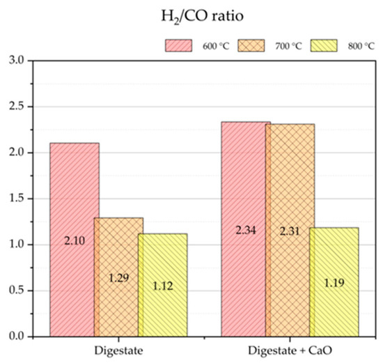 The syngas with the highest molar ratio H2/CO equal to 2.34 was detected when digestate was pyrolyzed at 600 °C with CaO (Figure 8).
