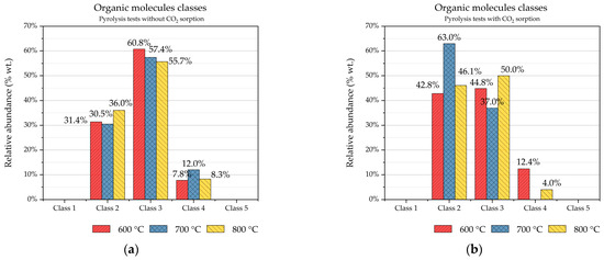 The organic fraction of condensable products was analysed by GC-MS. The detected organic molecules were classified according to the ECN tar classification to have a general framework and immediacy in the comprehension of the process. The relative abundances of the organic molecule classes of the condensable products of the six pyrolysis tests are shown in Figure 9. In the case of pyrolysis of digestate, class III is the most abundant one (Figure 9a). Chemical compounds with one aromatic ring, such as xylene, styrene, and toluene, belong to this class. When CaO is added to the pyrolysis process, an evident reduction in chemical compounds of class III was observed, as well as a reduction in chemical compounds belonging to class IV, which are organic molecules with two or three aromatic rings, such as naphthalene, phenanthrene, anthracene, and fluorene. Very probably, this reduction is caused by the catalytic effect of CaO in steam, dry reforming, and cracking reactions of the molecules of classes III and IV. In recent years, there has been growing interest in innovative materials capable of promoting the catalytic cracking of aromatic molecules in syngas, as extensively documented in the scientific literature [26,27]. The organic molecules of class II are heterocyclic components (like phenol, pyridine, cresol), generally having high water solubility, due to their polarity. From the comparison of Figure 9a,b, CaO does not have an evident catalytic action on these molecules.