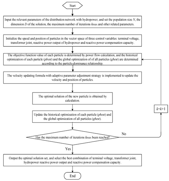 The flow chart of the RP optimization control method for DN with hydropower based on the improved discrete PSO algorithm is shown in Figure 1.