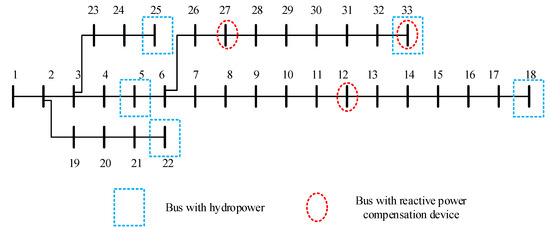 This paper conducts simulation analysis based on the IEEE-33 buses distribution system to verify the impact of RP output after hydropower integration on the power grid system. The main reason why this paper chooses the IEEE-33 buses distribution system for simulation is that the number of buses and the topological complexity of the system can not only reflect the operation characteristics of the actual distribution network, but also will not lead to excessive calculation, which is suitable for the rapid verification of the proposed method. As shown in Figure 2, the IEEE-33 buses system is a radial DN consisting of a total of 33 buses and 32 branches. The rated voltage of the system is 12.66 kV, with a base power value of 10 MVA. The total load of the system is 3715 + j2300 kVA, and the baseline active power loss of the original system is 203.03 kW. To construct a distribution system incorporating hydropower, small hydropower plants are connected at buses 5, 18, 22, 25, and 33 of the system, the access capacity of each bus is 1000 kW, and the total capacity is 5000 kW. Additionally, six sets of switchable RP compensation devices are installed at buses 12, 27, and 33, with each set having a single-group capacity of 80 kVar. The voltage ratio range of the on-load tap-changing transformers in the system is 0.95 to 1.05, with a unit tap adjustment of 0.05. The allowable voltage range at each bus of the system is 0.9 to 1.1 pu. The system simulations are performed in the Matlab R2014 environment. The PSO algorithm proposed in this paper uses a particle population size of N = 60 and a maximum iteration count of kmax = 100.