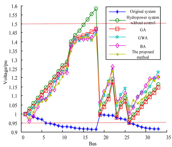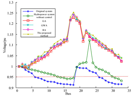 As shown in Table 2, during the high-water period with low loads, the generators operated in leading power factor mode, delivering active power while absorbing RP. Based on the GA, the RP absorbed by the hydropower stations at buses 5, 18, 22, 25, and 33 are 62 kVar, 54 kVar, 97 kVar, 84 kVar, and 35 kVar, respectively. Based on the GWA, the RP absorbed by the hydropower stations at buses 5, 18, 22, 25, and 33 are 58 kVar, 77 kVar, 89 kVar, 92 kVar, and 44 kVar, respectively. Based on the BA, the RP absorbed by the hydropower stations at buses 5, 18, 22, 25, and 33 are 53 kVar, 67 kVar, 92 kVar, 98 kVar, and 62 kVar, respectively. Based on the method proposed in this paper, the RP absorbed by the hydropower stations at buses 5, 18, 22, 25, and 33 are 64 kVar, 72 kVar, 90 kVar, 86 kVar, and 63 kVar, respectively. It can be inferred that during the high-water period, when hydropower units are operating at full capacity, constraints such as temperature rise during leading power factor operation need to be considered. Consequently, the RP absorption by the generators in this mode is relatively low. At this time, all RP compensation devices are deactivated to prevent system overvoltage. The comparison of bus voltages in the system is shown in Figure 3.