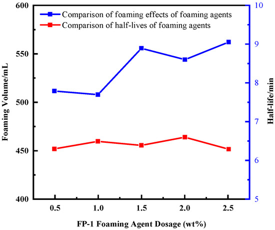 To further investigate the impact of different dosages of FP-1 foaming agent on foaming performance, this study tested the foaming volume and half-life under stirring conditions at 11,000 r/min for 1 min, within a dosage range of 0.5% to 2.5%. As shown in Figure 1, within the tested range, FP-1 exhibited some sensitivity to dosage changes in terms of foaming volume and half-life, but overall differences were relatively small. At a dosage of 1.5%, the foaming volume reached 556 mL, with a half-life of 6.4 min, demonstrating good overall performance. While higher dosages might yield marginally higher initial foaming volumes, 1.5% represents an optimal balance between achieving excellent foaming performance and practical considerations such as treatment agent costs and minimizing potential risks of formation damage. Considering treatment agent costs and potential risks of formation damage, a dosage of 1.5% was selected as an optimal range for subsequent system formulation optimization.
