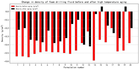 Figure 2 illustrates the density changes of all tested formulations before and after 16 h of aging at 200 °C. A clear trend observed is that the density of nearly all formulations increased to varying degrees after aging. Formulations 3, 6, 9, and 13 exhibited particularly significant increases in density, often rising by over 0.1 g/cm3 (e.g., Formulation 3 increased from ~1.03 to ~1.15 g/cm3), indicating substantial liquid phase loss or degradation. The primary reason for this increase is the evaporation of part of the liquid phase (water), the increased solubility of the gas phase (air/nitrogen), or its escape from the system during high-temperature and high-pressure aging. This leads to a relative enrichment of heavier solid or non-volatile liquid components in the system, resulting in an overall increase in macroscopic density. A smaller increase in density indicates less water loss or gas phase loss at high temperatures, suggesting better stability. Quantitatively, a density increase of less than 0.05 g/cm3 is considered indicative of excellent stability, while increases greater than 0.1 g/cm3 suggest significant instability. As shown in Figure 2, Formulations 10, 11, 14, 15, and 19 exhibited relatively smaller increases in density, indicating that these systems maintained better component stability at 200 °C.