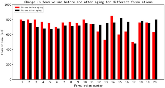 Figure 3 illustrates the volume changes of the foam drilling fluid systems before and after 16 h of aging at 200 °C. Volume change is a direct indicator of foam stability. A decrease in volume is typically caused by foam breakdown, gas phase escape, and liquid phase evaporation due to high temperatures. Interestingly, the volumes of some formulations slightly increased (e.g., Formulations 12 and 13). This phenomenon may be attributed to high-temperature-induced hydration expansion of certain water-sensitive polymers or cross-linkers within the system, leading to an increase in the overall volume of the liquid phase. Alternatively, minor decomposition of certain components at elevated temperatures might generate gaseous byproducts, contributing to a slight increase in total volume if trapped within the system. However, this trend is not prominent overall. A smaller volume change indicates better stability of the foam structure and liquid phase volume under high-temperature conditions. Specifically, volume changes within ±10 mL indicate good stability, whereas larger changes point to significant foam breakdown or liquid phase loss/expansion. As shown in Figure 3, Formulations 7, 8, 9, 11, 16, and 18 exhibited smaller volume changes, demonstrating relatively better volume stability. This suggests that these formulations are more effective in maintaining the macroscopic structure of the foam system at 200 °C.