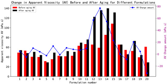 For Formulations 5 and 20, the AV decreased after aging, dropping significantly from its initial values (e.g., Formulation 5 decreased from ~60 mPa·s to ~20 mPa·s), which is typically caused by the thermal degradation of polymers (e.g., stabilizers or viscosity enhancers) under high-temperature conditions, resulting in molecular chain breakage. This indicates insufficient temperature resistance of key polymers in these formulations, significantly affecting the rheological stability of the system. Generally, maintaining AV values between 30 and 60 mPa·s after aging is desirable for effective cuttings transport and pumping, with significant increases or decreases indicating performance degradation. Formulations 7 and 17 exhibited relatively low AV values after aging, with smooth and stable changes, maintaining AV values between 40 and 50 mPa·s (e.g., Formulation 7 from 47.5 to 46.5 mPa·s), indicating that these formulations have good viscosity control performance.