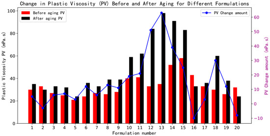 Figure 5 presents the changes in plastic viscosity (PV) of the foam drilling fluid systems before and after 16 h of aging at 200 °C. PV primarily reflects the internal friction force of the fluid under higher shear rates and is related to the efficiency of rock removal at the well bottom. Similar to AV, the PV of most formulations showed an increasing trend after aging, although the magnitude of the increase was generally smaller than that of AV. For instance, Formulations 12, 13, 14, and 15 saw PV increase from around 20–30 mPa·s to 40–60 mPa·s, suggesting increased solid–liquid interactions or particle aggregation. The increase in PV may be attributed to enhanced aggregation or interaction of dispersed phases under high-temperature conditions. For Formulation 20, PV significantly decreased, dropping from approximately 30 mPa·s to around 10 mPa·s, and Formulation 5 also showed a slight decrease, which further confirms polymer degradation or insufficient system stability in these formulations at 200 °C. Optimally, PV values should remain below 35 mPa·s after aging for good flow efficiency and reduced pressure losses, and stable changes are preferred. Formulations 1, 2, 7, 8, and 17 exhibited relatively low PV values after aging, with smooth and stable changes, generally remaining below 30 mPa·s after aging (e.g., Formulation 7 from 24.5 to 25 mPa·s), indicating better control of dispersed phase behavior and high-shear rheological performance under high-temperature conditions.