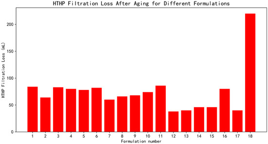 Figure 6 illustrates the high-temperature, high-pressure (HTHP) filtration loss of the foam drilling fluid systems after 16 h of aging at 200 °C. HTHP filtration loss is a critical indicator for evaluating the water loss capability of drilling fluids under real in-well high-temperature and high-pressure conditions, closely related to formation damage and wellbore stability. For HTHP fluid loss, values below 20 mL are considered excellent, 20–50 mL are good, and above 50 mL are poor. A distinct and crucial trend observed in Figure 6 is the remarkably lower HTHP filtration loss values exhibited by Formulations 12, 13, 15, 16, and 19 compared to other formulations. For example, these superior formulations generally maintain HTHP fluid loss below 20 mL, while others like Formulations 1, 2, 5, 6, and particularly 10 and 11, show significantly higher values, often exceeding 100 mL (e.g., Formulation 10 reached over 200 mL). This trend indicates superior filtration control under extreme conditions. Low HTHP filtration loss is typically attributed to thermally stable polymers, small and uniformly dispersed solid particles, and the formation of a dense, low-permeability mud cake. Notably, Formulation 16, which incorporates 1% FP-1 and 0.3% GWPJ (the selected high-temperature-resistant foaming agent and foam stabilizer, respectively), exhibited excellent HTHP filtration control, highlighting the synergistic effect of these components in maintaining system integrity under extreme conditions. Formulations 12, 13, 15, and 16 demonstrate excellent performance in both API and HTHP filtration loss, indicating a significant advantage in filtration control across the full temperature range (ambient and 200 °C HTHP conditions). This highlights their robust performance and reliability in practical drilling operations under diverse thermal and pressure conditions.