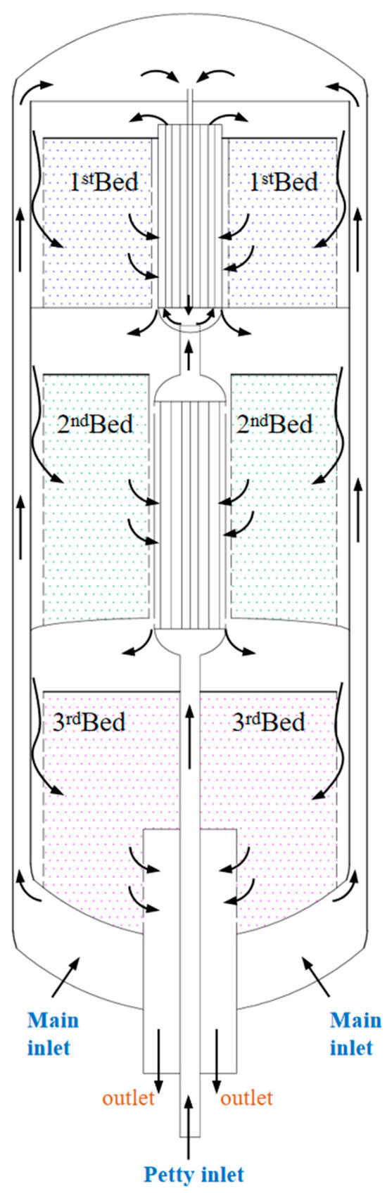 This study focuses on a three-bed ammonia synthesis reactor with radial–axial flow and two intermediate heat exchangers. The reactor is based on an industrial-scale ammonia synthesis reactor initially developed by Zardi et al. [17] and later improved by Azarhosh et al. [18], featuring intermediate coolers and simulated/optimized under two configurations: one with an intercooler and another with dual quench streams. Due to the reactor’s high axial symmetry, appropriate simplifications were applied during modeling for simulation purposes.