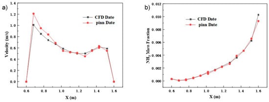 Comparison of PINN and CFD axial distribution results. (a) Comparison of axial velocity distribution; (b) comparison of ammonia mole fraction distribution.